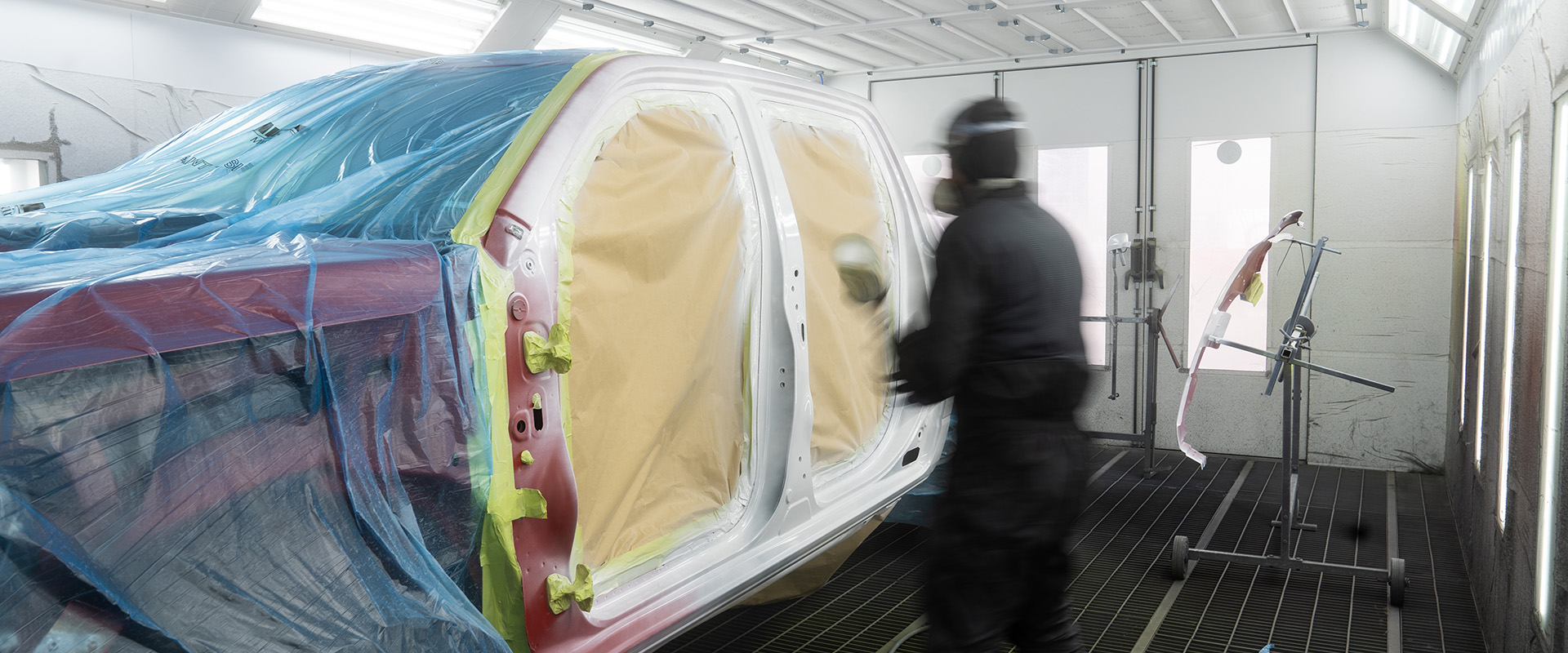Klimatisierte Lackierkabine mit Überdruck-Belüftung für staubfreie, gleichmäßige Ergebnisse direkt nach Herstellerstandard.